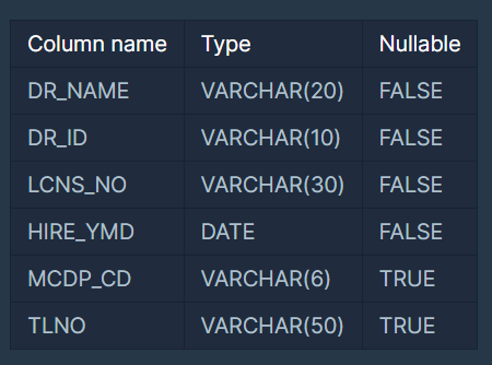 다음은 종합병원에 속한 의사 정보를 담은 DOCTOR 테이블입니다. DOCTOR 테이블은 다음과 같으며 DR_NAME, DR_ID, LCNS_NO, HIRE_YMD, MCDP_CD, TLNO는 각각 의사이름, 의사ID, 면허번호, 고용일자, 진료과코드, 전화번호를 나타냅니다.