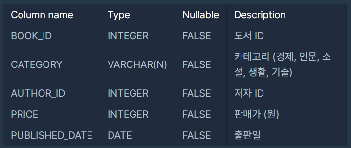 BOOK 테이블은 각 도서의 정보를 담은 테이블로 아래와 같은 구조로 되어있습니다.