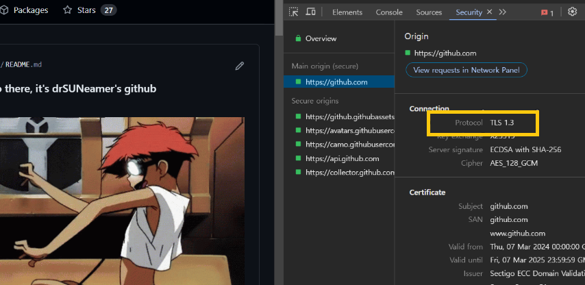 Security 탭을 켠 상태로 새로고침을 하거나 사이트에 접속하면 Main Origin의 링크를 눌렀을 때 연결 프로토콜에 TLS 정보가 뜬다. 깃허브는 현재 1.3